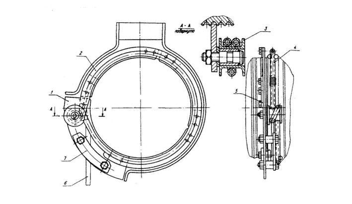 Канатоукладчик представляет собой кольцевое устройство, охватывающее барабан, собранное из четырех секторов 2 и 1, скрепленных между собой специальными планками 5. Внутренняя поверхность секторов закруглена и входит в винтовую канавку барабана. Сектор 1 установлен между отбортовками сварного корпуса, что исключает вращение кольцевого устройства при работе. На секторе 1 смонтированы направляющая планка 7 и ролик 3. Вокруг барабана и ролика натянута специальная бесконечная пружина 4. Грузовой канат 6 проходит между сектором и направляющей под пружину, которая прижимает его к канавке барабана. При работе механизма передвижения канатоукладчик перемещается по барабану, укладывая канат в канавку или освобождая его.