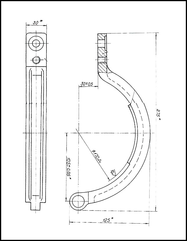 Тормоз состоит из двух тормозных колодок (феродо), каждая из которых имеет фрикционную накладку, шкива, пружины и растормаживающего рычага.